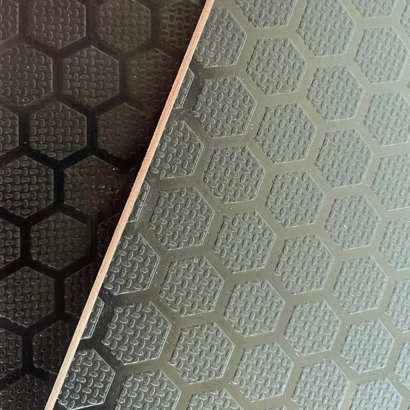 Hexa Non-Slip F17 is constructed with an A-bond glue and has black overlay Eucalyptus veneers. It has a raised hexagonal patten, double sided with one side being more pronounced and is extremely hard wearing. It can be easily cut for multiple purposes including; shelving, horse floats, bus and camper trailer fit outs & truck body floors.